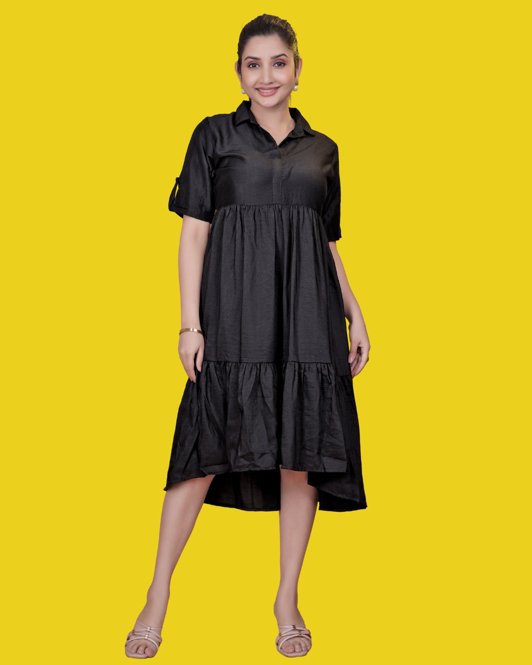 Material Type : Chinon Wash Instruction : Mild Machine wash  Solid Black Midi Dress Model height: 5'9"...