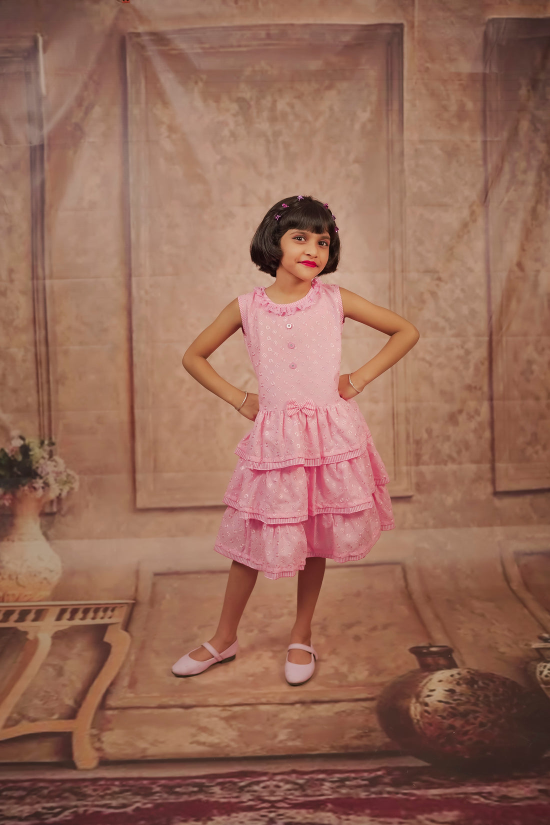 Pariari Girls Sleeveless Pink Layered Ruffle Cotton Frock with Embroidery