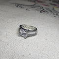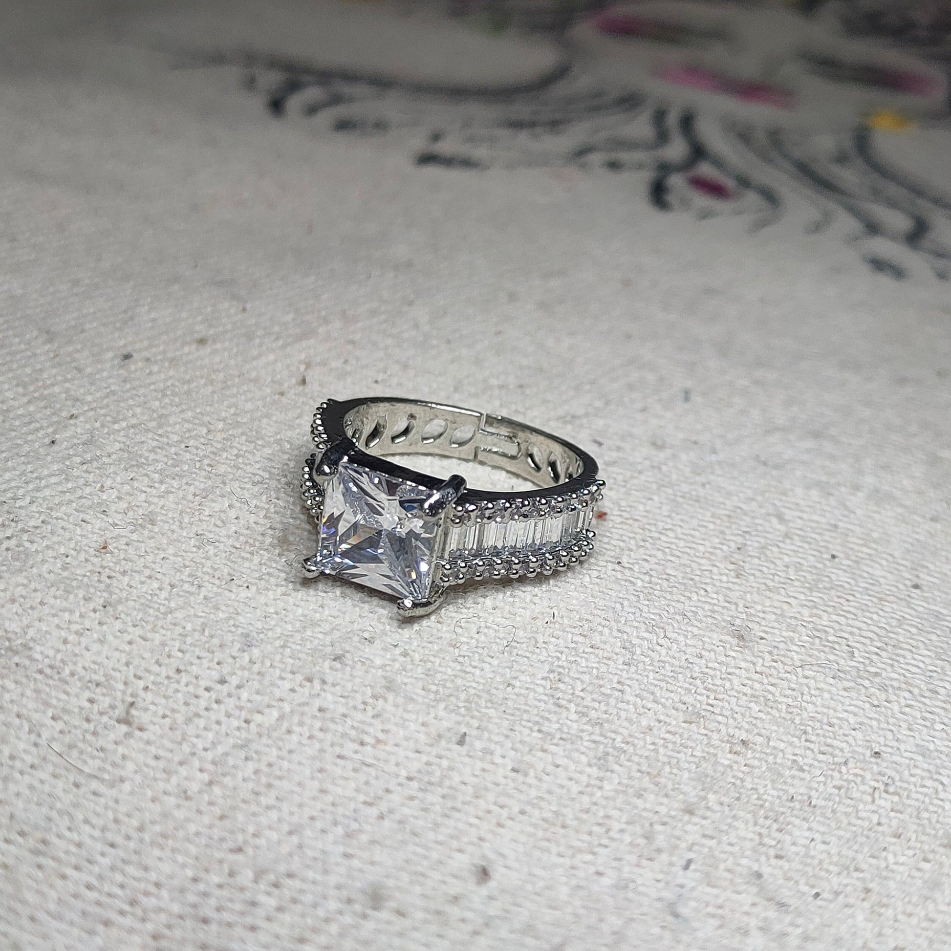 The ring in the image is identified as a Bel Viaggio 14k White Gold Moissanite Engagement Ring. It features a large, square-cut moissanite stone as its centerpiece, flanked by smaller baguette-cut stones set along the band. Moissanite is a lab-created gemstone known for its brilliance and durability, often used as a diamond alternative. It is made of silicon carbide and is almost as hard as a diamond.