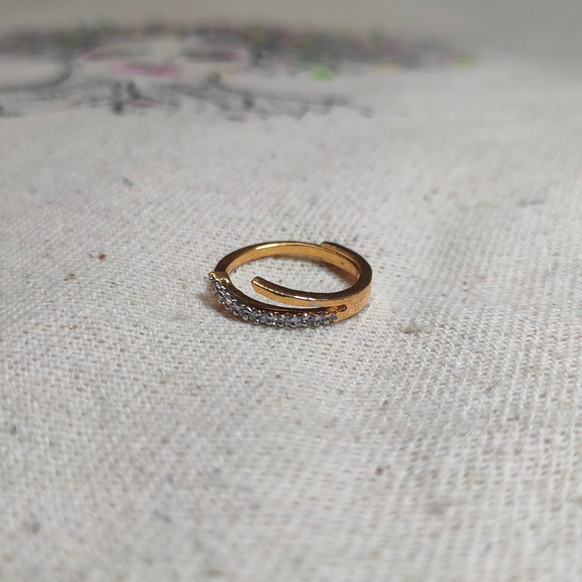 This style features an open design where the ends of the ring do not meet, creating a wrap-around or "bypass" effect on the finger. The ring in the image appears to be crafted from gold, possibly 18k gold plated as suggested by the related image search result. One side of the ring is plain gold, while the other is adorned with a row of small diamonds or cubic zirconia, adding a touch of sparkle. The open design and the combination of plain gold and stones create a modern and elegant look. Bypass rings come in various designs, from simple and minimalist to more elaborate and decorative styles. They are a popular choice for everyday wear and can also be worn as statement pieces for special occasions.