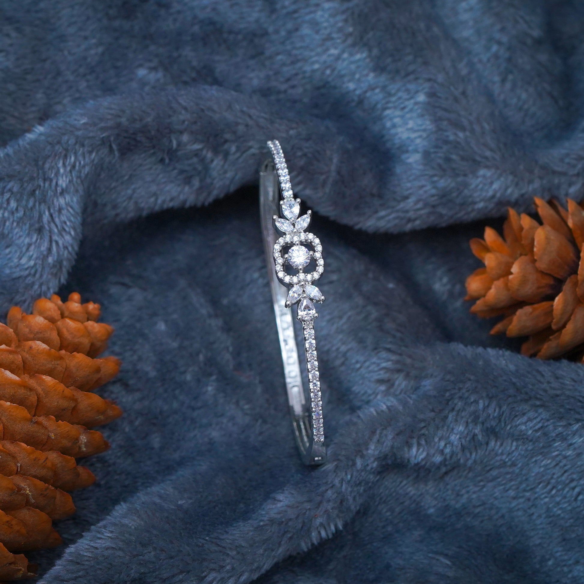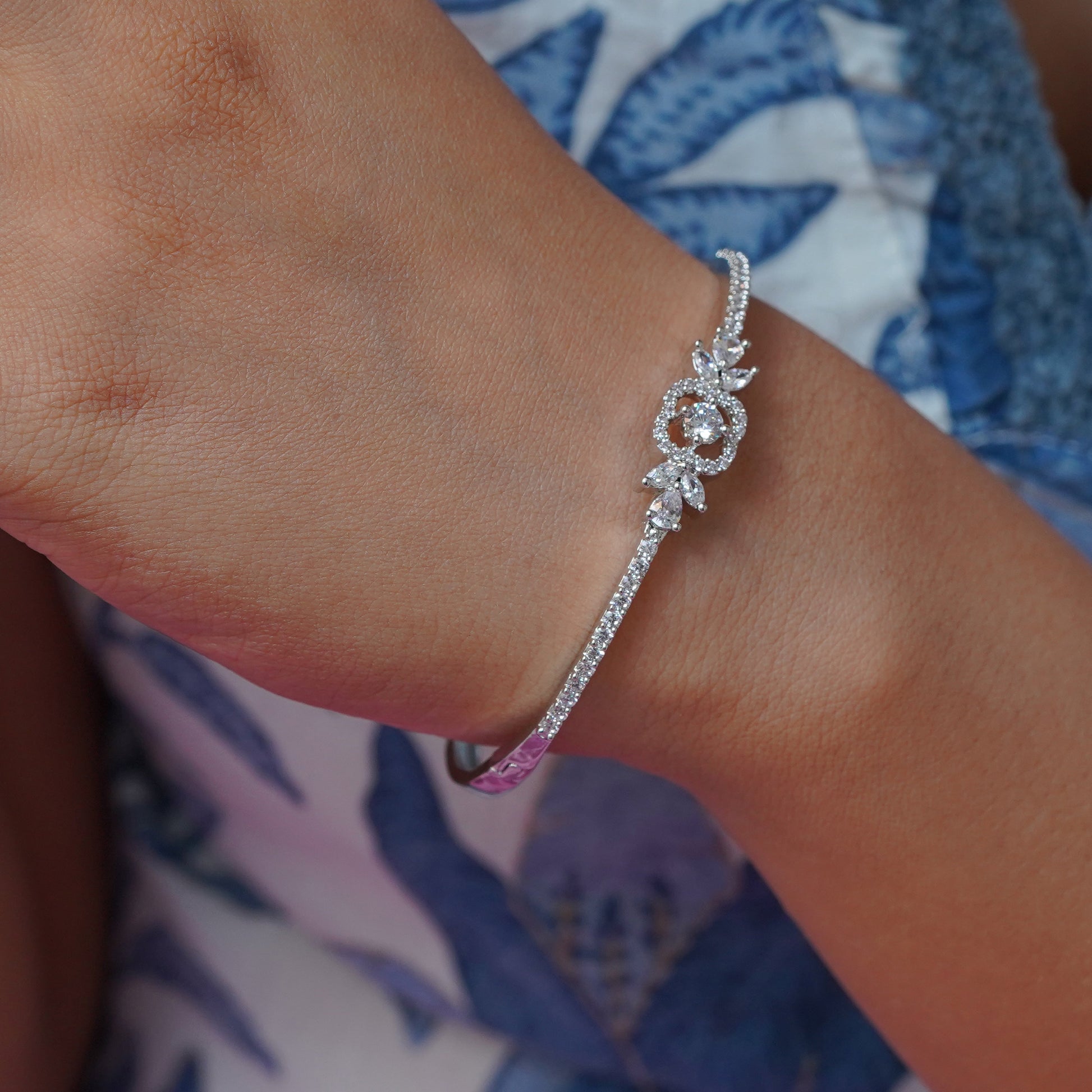 The bracelet in the image is most likely a Cubic Zirconia Tennis Bracelet, featuring a floral or leaf-shaped centerpiece. This type of bracelet is characterized by a single row of small gemstones, usually cubic zirconia, set in a metal band, often silver or white gold.