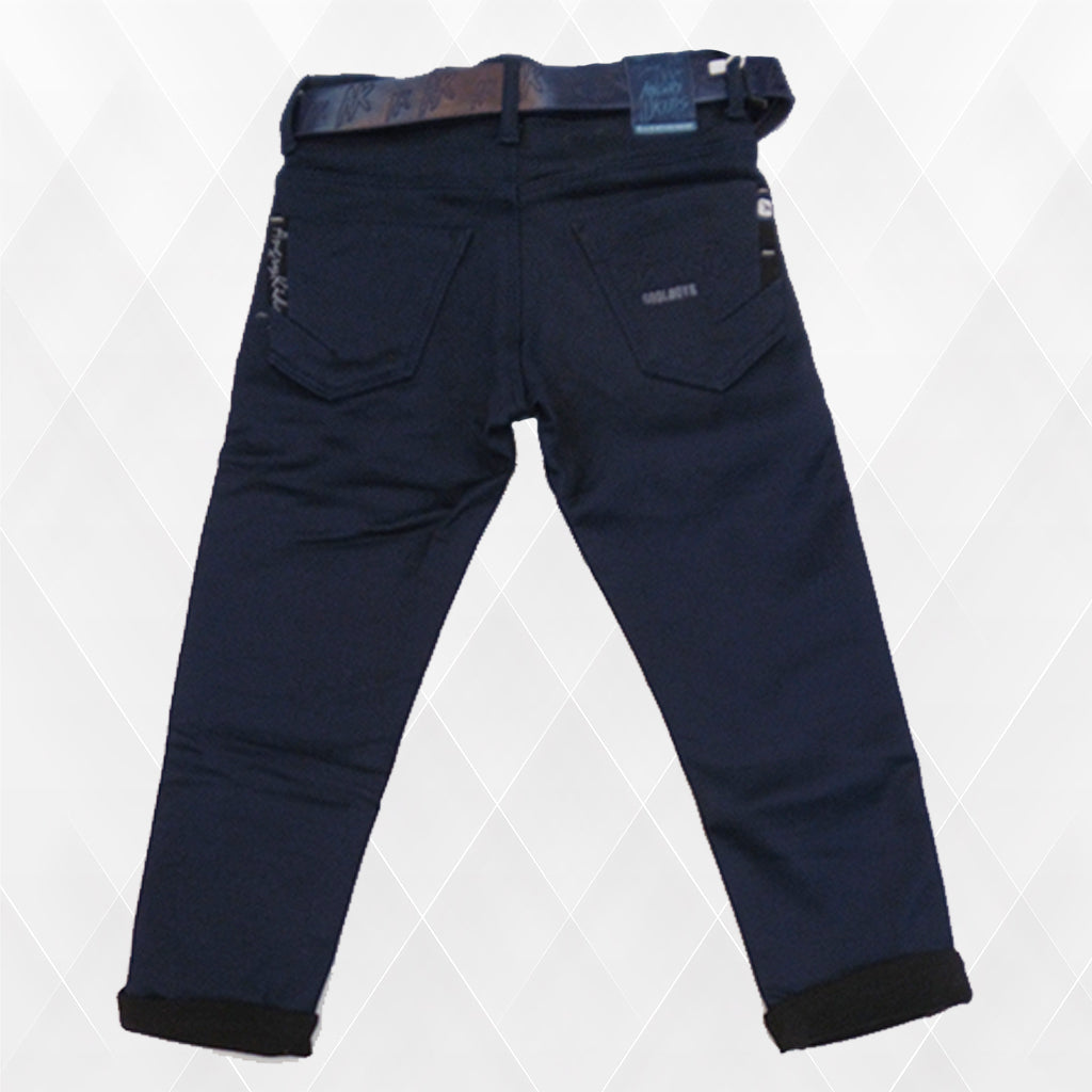 These stylish slim-fit navy blue jeans for boys come with a trendy printed design on the legs and subtle embroidery details. The jeans feature a comfortable fit with a matching belt, adding a fashionable touch. The fabric is durable yet soft, making it perfect for casual wear or special occasions. The turned-up hems with black contrast detailing enhance the overall look.