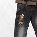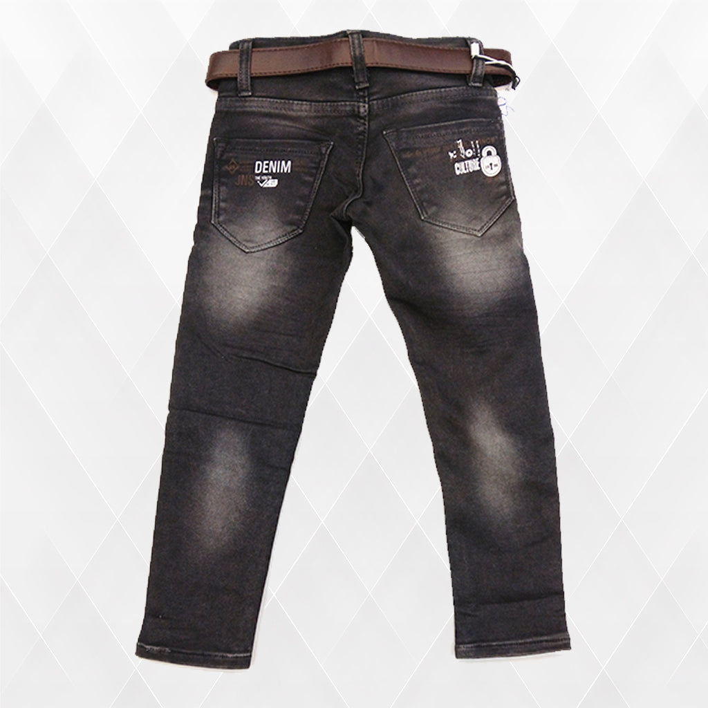These fashionable boys' jeans are crafted from high-quality denim fabric, offering durability and comfort for all-day wear. Designed in a trendy dark-wash shade with stylish fading effects, they feature unique embroidered and printed patches on the front for a modern and edgy look. The slim-fit cut provides a sleek silhouette, while the contrast stitching enhances the overall design. Equipped with multiple pockets for practicality, these jeans also come with a stylish brown belt featuring a sturdy buckle. Perfect for casual outings, parties, or everyday fashion, these jeans combine comfort and style effortlessly. |