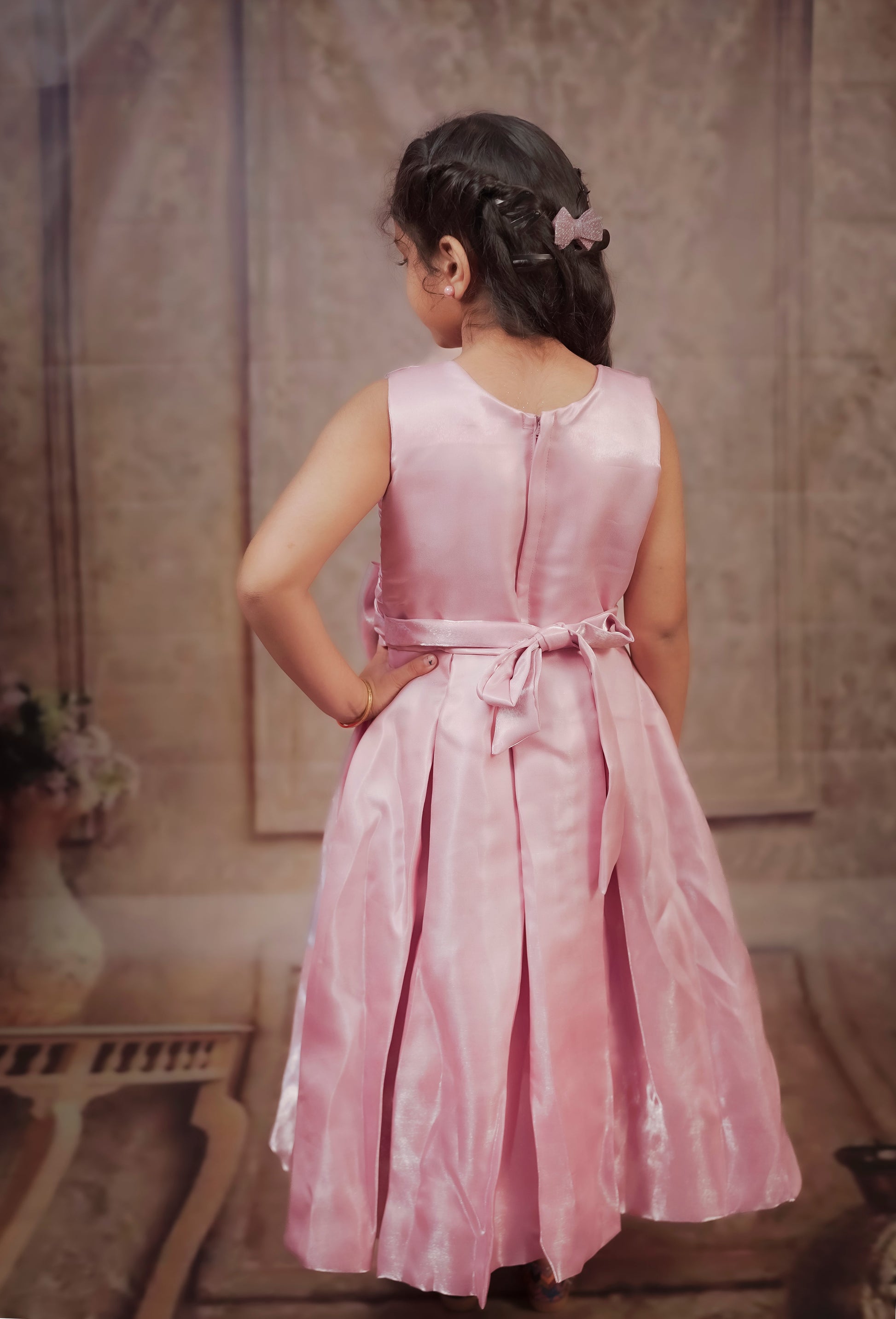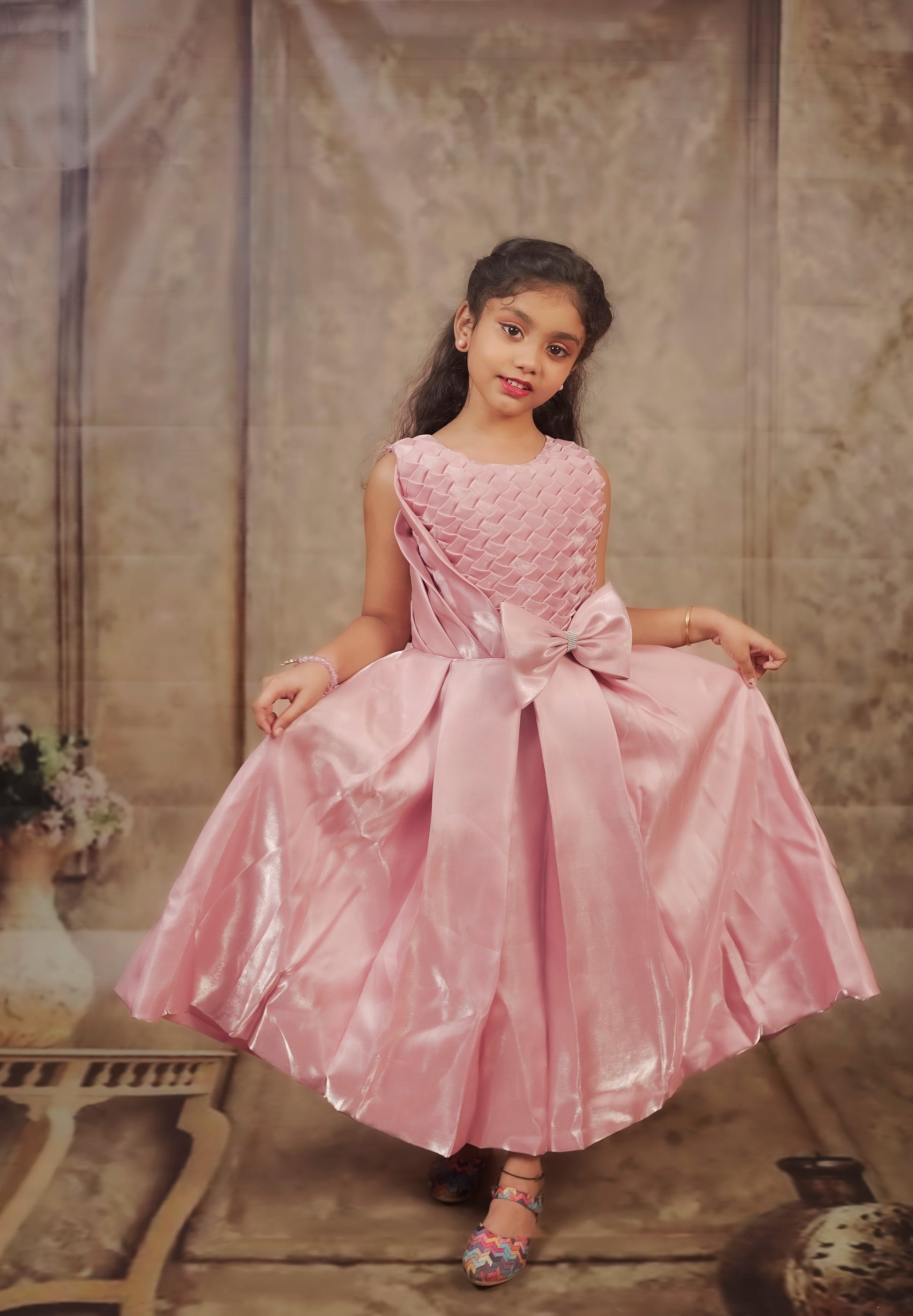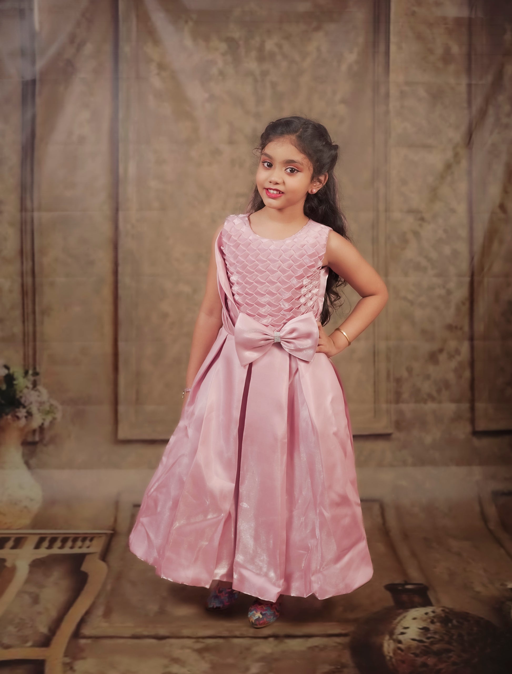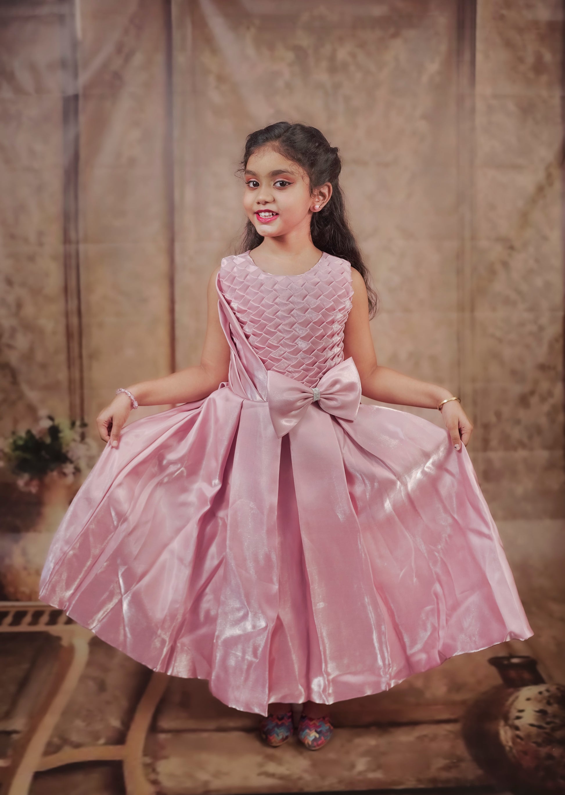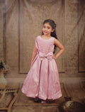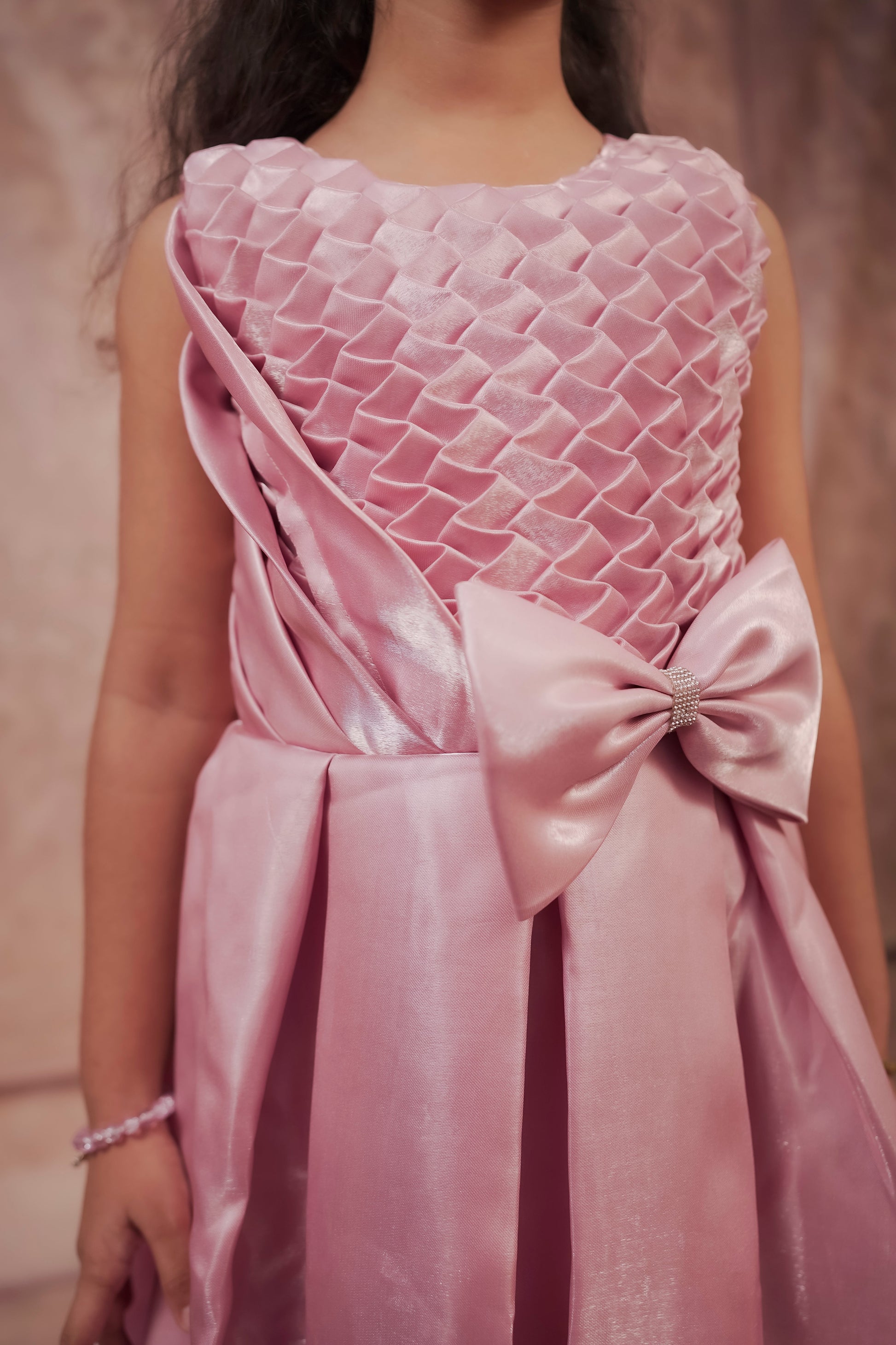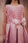 A sleeveless, elegant lavender dress for young girls. The upper bodice features an intricate textured diamond pleat design, while the lower half is made of a shimmery satin-like fabric that falls gracefully. A large bow with a small central embellishment accents the waist. The pleated diamond pattern on the bodice is eye-catching and unique. The large bow at the waist adds charm and draws attention. The shimmer of the skirt gives it a festive, princess-like appearance. |