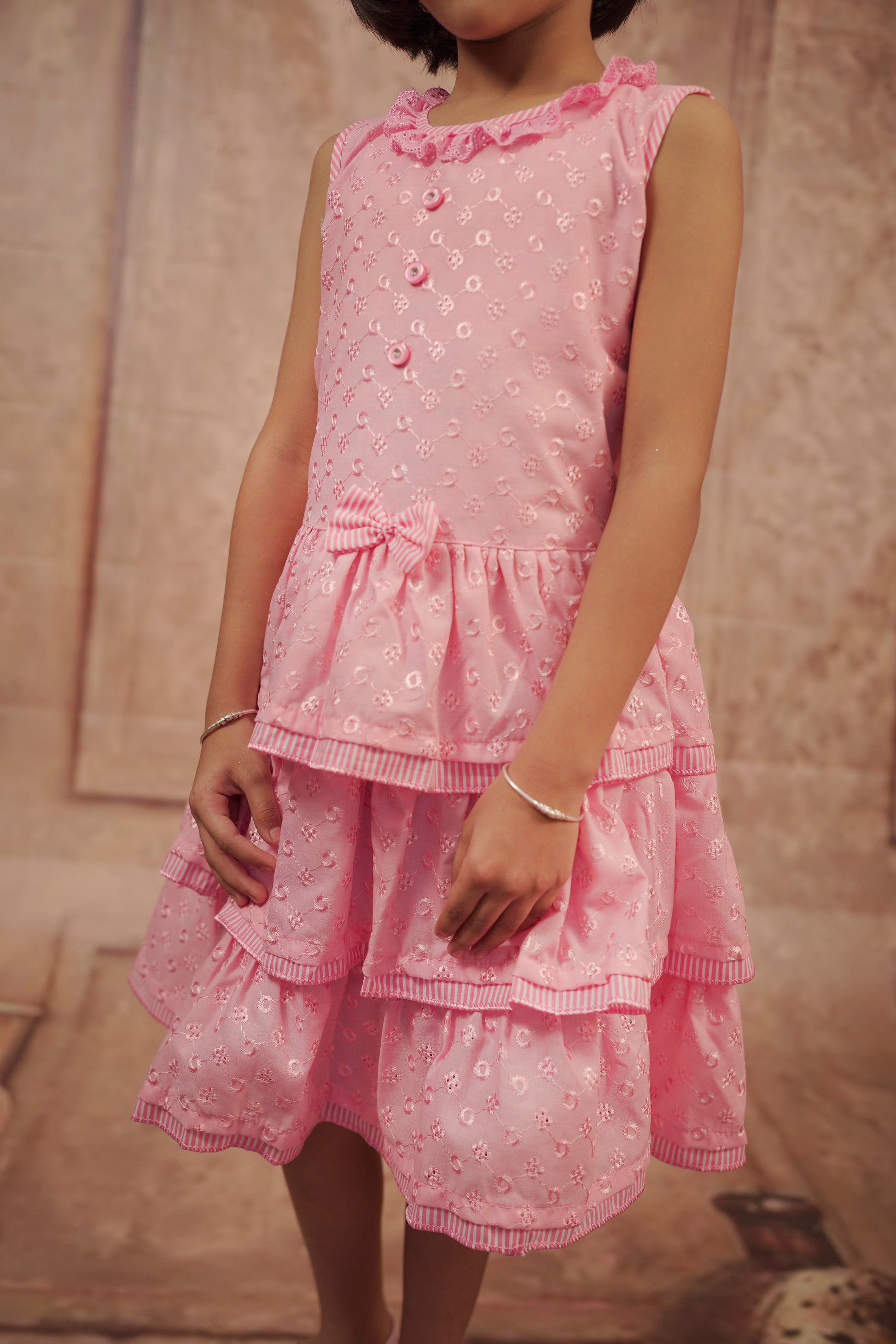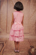Pariari Girls Sleeveless Pink Layered Ruffle Cotton Frock with Embroidery